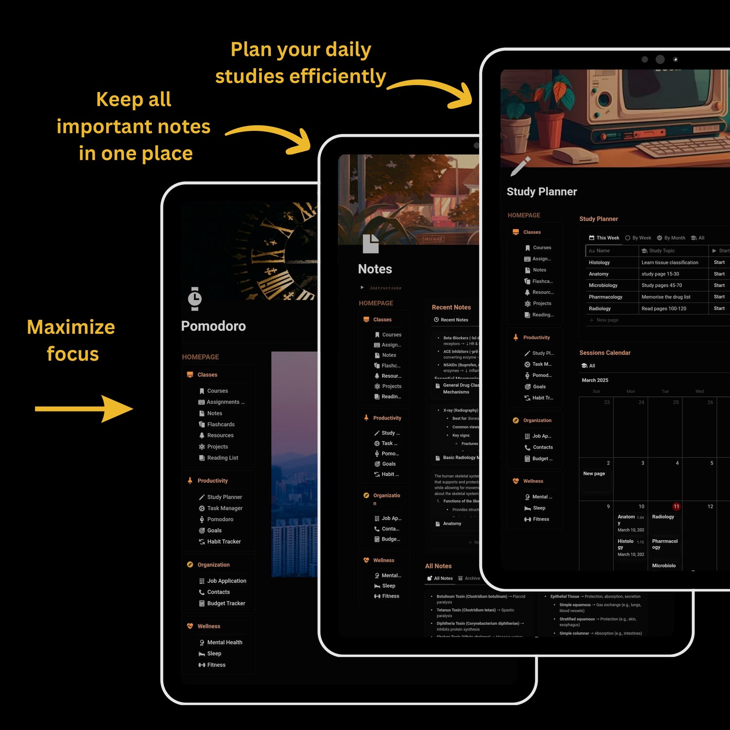 Unlock the power of Notion to streamline your med school journey. Keep everything in order, manage your time efficiently, and focus on what truly matters—your success. Let our Notion templates be the tool that propels you through med school with ease.